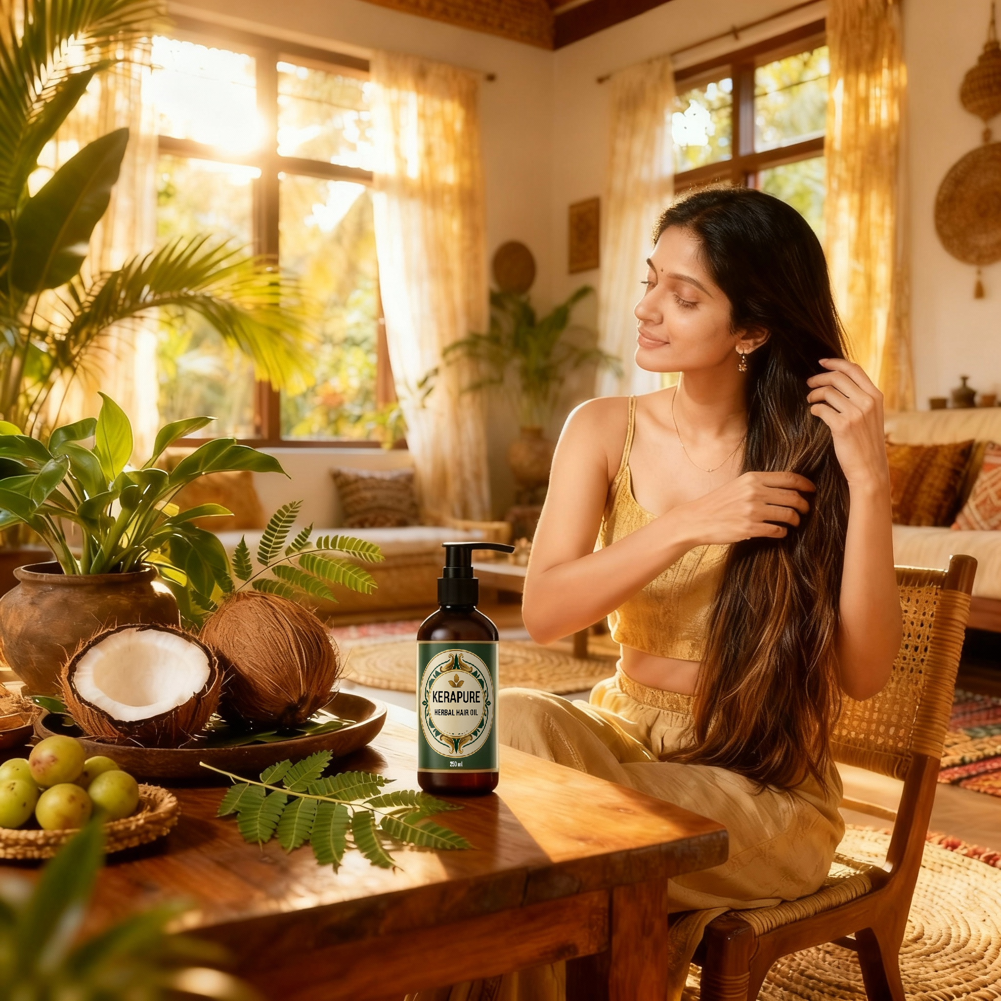 KeraPure was born from a simple belief — that nature holds the secret to truly healthy hair. Our herbal hair oil is crafted from 100% natural ingredients, many sourced from the lush landscapes of Kerala, the birthplace of Ayurveda.