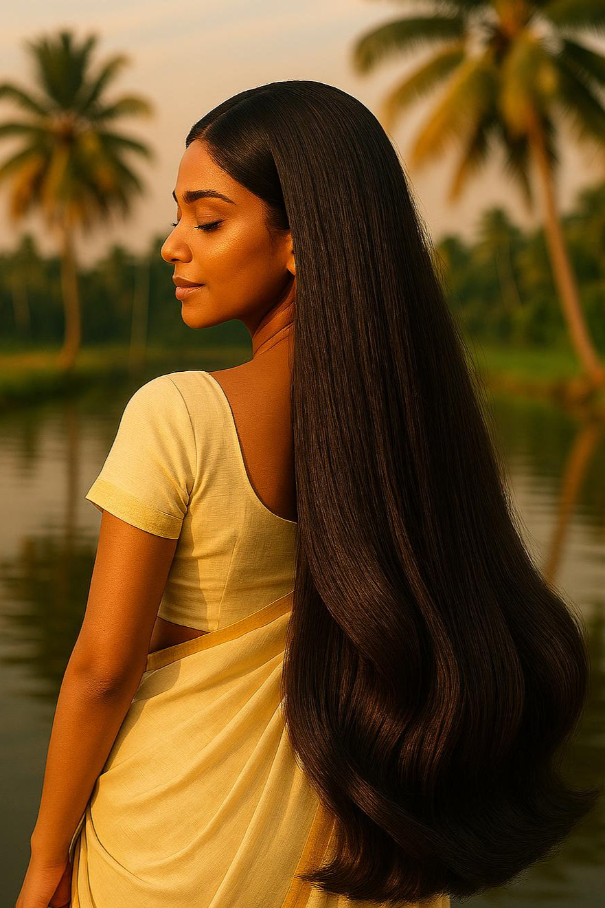 Cold-pressed coconut oil, Bhringraj, Amla, Brahmi, Hibiscus, Fenugreek, Curry Leaves, Neem, Aloe Vera extract, and other traditional Ayurvedic botanicals.